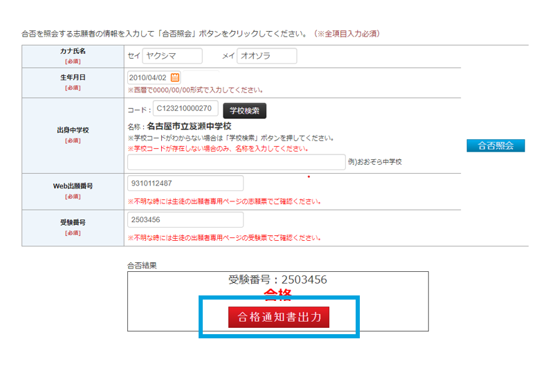 「合否照会」を押してください。画面の下に合否結果が出ます。